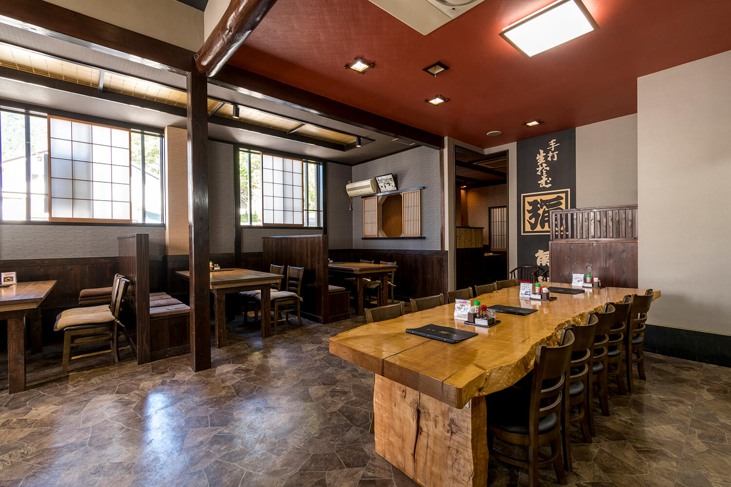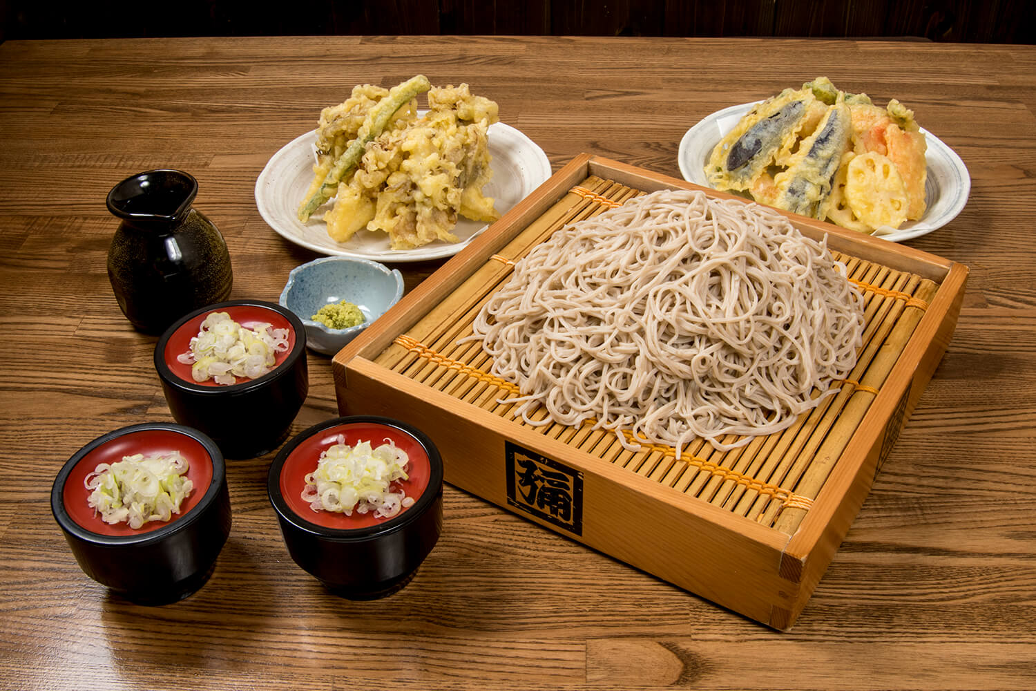 新潟県で創業以来、250年以上愛され続けている老舗中の老舗。押しも押されもせぬ看板メニューは、とことん手打ちにこだわった「へぎそば」(写真は3人前2790円)です。殻をきれいに取り除いた抜き実を石臼で丁寧に挽いたそばの、風味の豊かさはピカイチ。1.5ミリの細打ち麺は、ゆであげるとすぐに裏山から湧き出る清水にさらします。こうすることで、キリッとしたコシが生まれるのだそうです。つゆに使用するのは、鰹節の中でも最高級品と位置付けられている1年以上熟成させた本枯れ節。必要な分だけ削って使うので、こちらも風味の良さが違います。凝縮した鰹節のうま味が広がる、上品な味わいのだしが生きたつゆはまろやかで、細打ちのそばにぴったり。「野菜天ぷら(1260円)」は、地元でとれた旬の野菜6~7種類が存分に楽しめます。